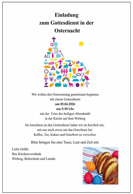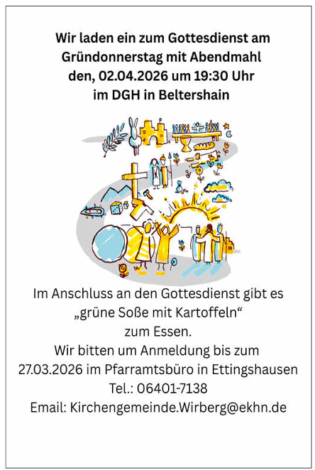 Am 07.06.2026 feiern wir die Konfirmationsjubiläen der Kirchengemeinden Wirberg und Beltershain in der Pfarrkirche Wirberg.