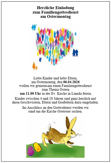 Am 14.06.2026 feiern wir die Konfirmationsjubiläen der Kirchengemeinde Lumda in der Kirche in Lumda. Der Festgottesdienst mit Heiligem Abendmahl beginnt um 10:00 Uhr. Zum Informationsabend laden wir alle Interessierte am 29.04.2026 um 19.00 Uhr in das Gemeindehaus nach Lumda ein.